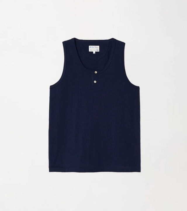 丸編機で作られた良質なコットン100%素材が心地良い肌触りです。2つボタンのタンクトップ。ほどよく体にフィットする細長いサイズバランスは着ていくうちに体型に合わせて馴染んでいきます。夏の半袖シャツのインナーやTシャツとの重ね着に活躍するアイテムです。