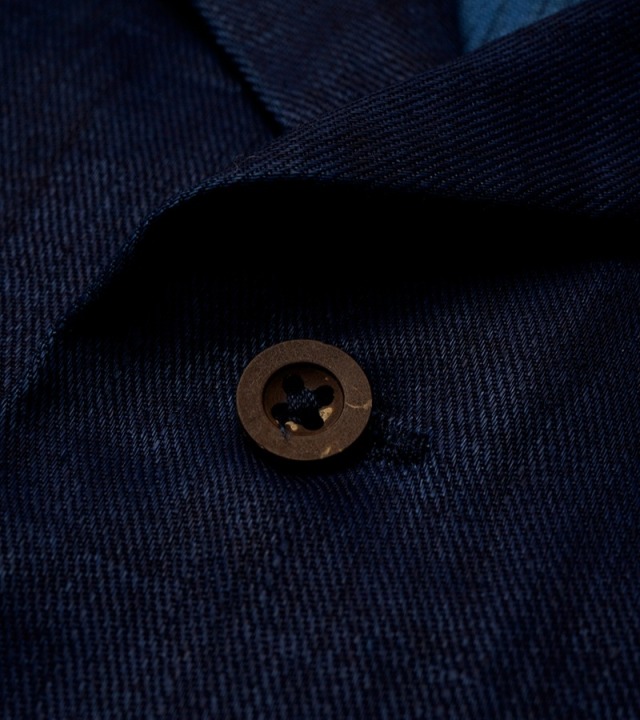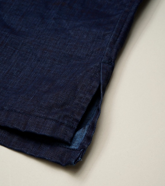 ナイジェル・ケーボンの夏の定番といえるオープンカラーシャツ。クラシックなフラップ付のパッチポケットが両胸に配置され、たっぷりした身幅のボックスシルエットです。素材は60番単糸という細番手の糸を高密度に織り上げたリネンツイル。25SSシーズンの新作でインディゴ、藍染めを施したスペシャルファブリックです。