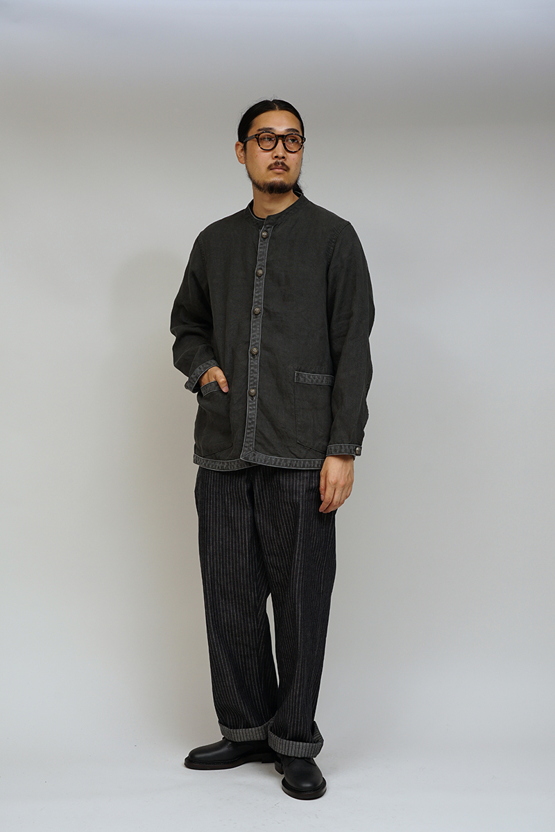 リネン100%のピンオックス素材のフレンチワークジャケットです。パイピングはコットンに硫化染。硫化のため程よい経年変化を楽しめます。リネンを高密度に織った素材感はしっかりしたコシがありリネンらしい適度なシワ感などリラックスした雰囲気が春夏に最適です。