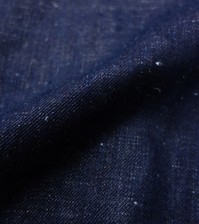 ナイジェルケーボンの定番素材ヘンプデニムを使用した見どころ満載のスタジアムジャケットです。ヘンプは麻の一種。極めて生命力の強い植物で、土壌の質を問わず自生します。ヘンプから繊維質を取り出し糸となしたヘンプ糸も極めて頑丈です。そしてヘンプの短繊維にはミクロン単位の穴が開いておりたくさんの空洞を持つ、所謂、多孔質の構造を持っています。そのためそれらが微細なクッションの役割を果たすため、ハリがあると共に柔らかなタッチがあります。 そして多孔質は水分を素早く吸収すると共に、余分な湿気を放出します。そのため汗を良くに吸ってしかも乾きやすい性質を持ちます。さらに水に濡れると強度を増します。天然の材料のほとんどは濡れると脆くなるので、これはほとんど麻だけが持つ性質です。そのため合成繊維の出現前の消防ホースは麻製でした。良いとこをばかりのようなヘンプですが、ウイークポイントもあります。繊維質を紡績して特に細い糸に成す事が困難で、さらにその糸を特に高密度に製織する事も極めて困難だという点です。 本ファブリックが極めて希少であり、本ファブリックに類するものを滅多に見ない理由がそれです。