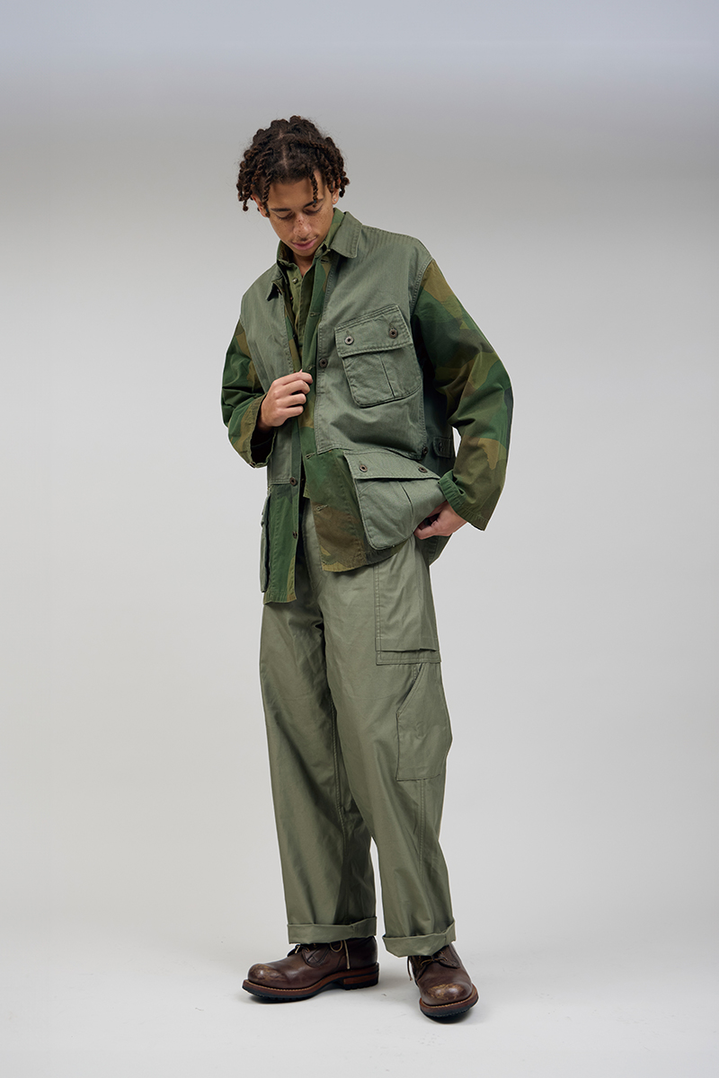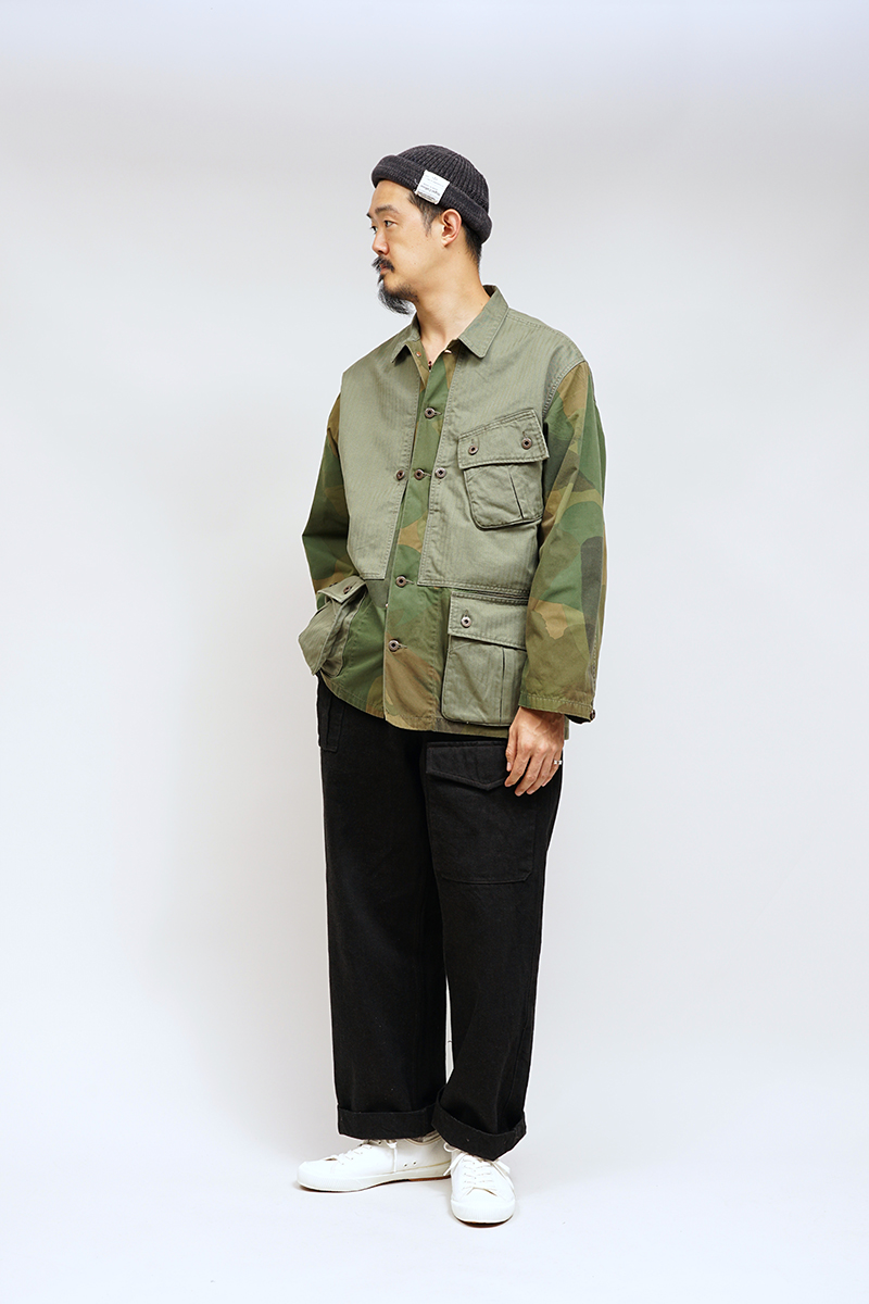 M44フィールドジャケットとトロピカル・コンバット・コート所謂ジャングルファティーグのディテールをミックスしたデザインです。 剥離迷彩プリントとヘリンボーンの凝ったコンビネーション。