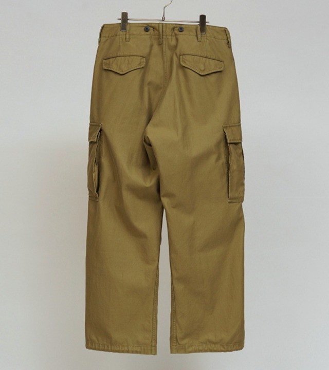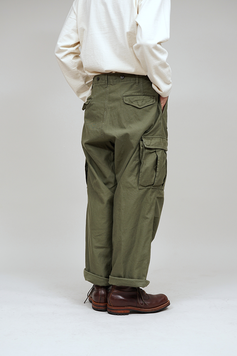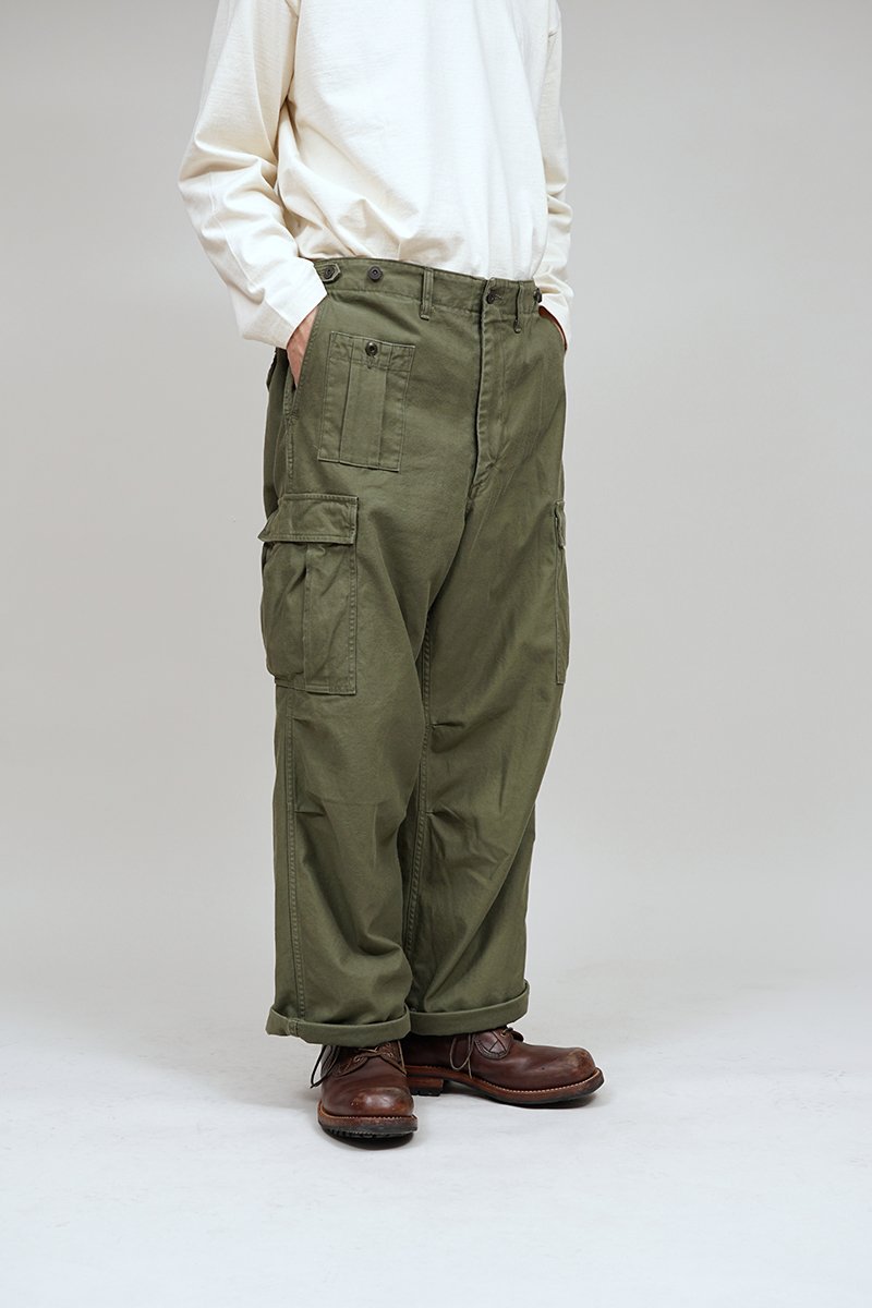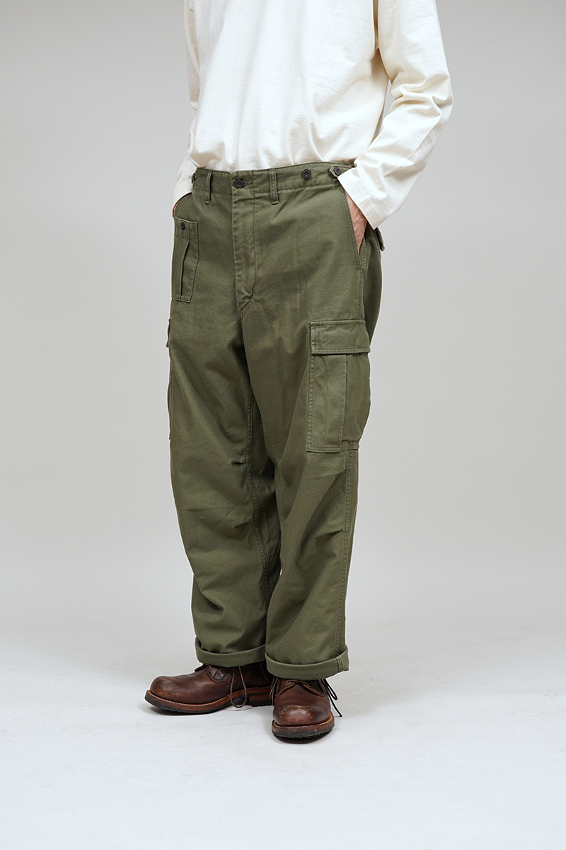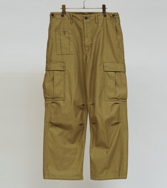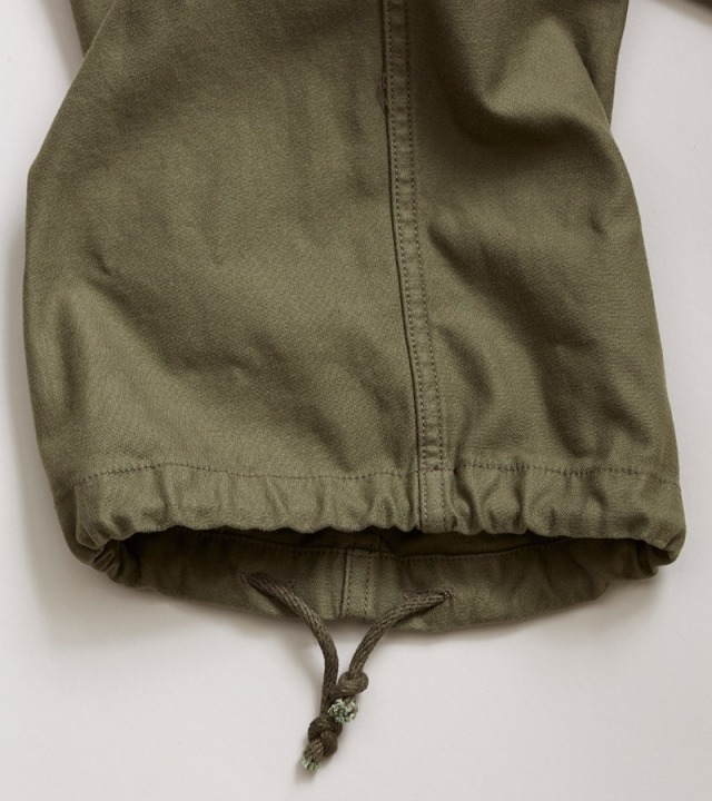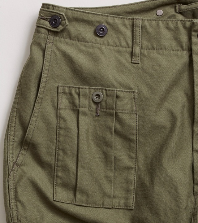 米軍のM-43と、カーゴパンツの傑作M-51、そして英国陸軍のビンテージをミックスしたデザインです。ファブリックはバックサテン。非常に剛性の高い組織です。素材はM-51同様にコットン100%。