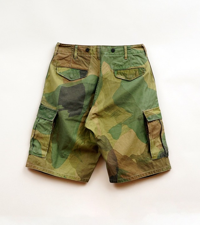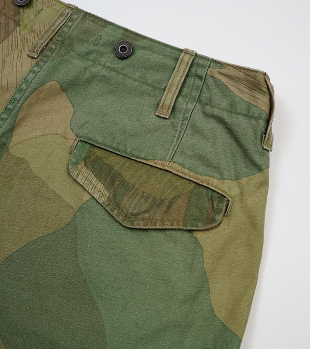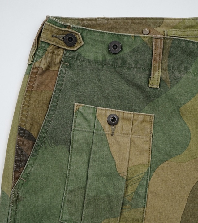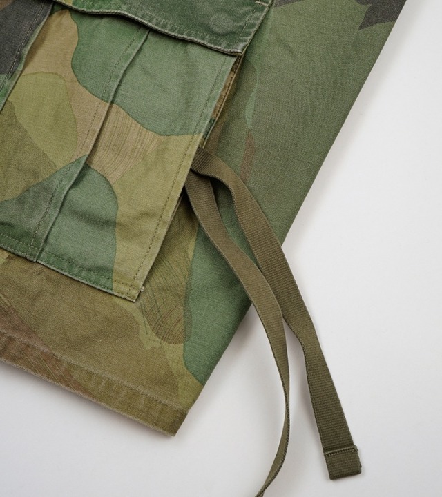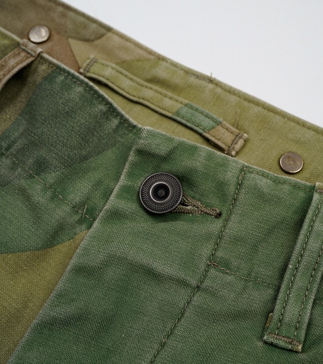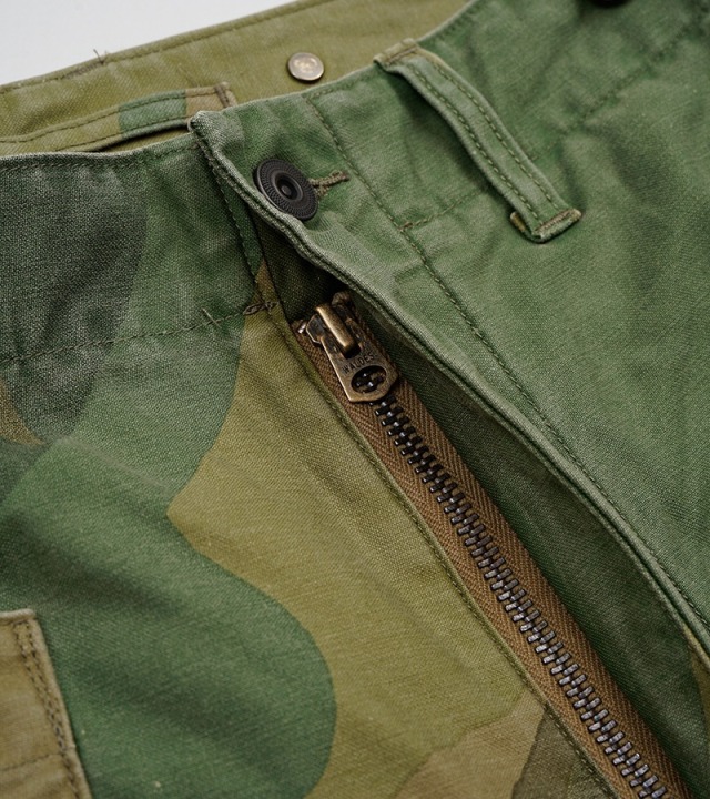 お馴染みのARMY CARGO SHORTでは意外なことにカモフラージュは今回が初。カモフラージュパターンは英国独特のディスラプティヴ・パターン・マテリアル。分断明細の名のとおり、大きく分断された色のブロックの視差により着用した人物のシルエットを崩し誤診させる効果があります。こうした大胆な構図と共に、要所要所には繊細な刷毛目を配し迷彩効果をより高めています。