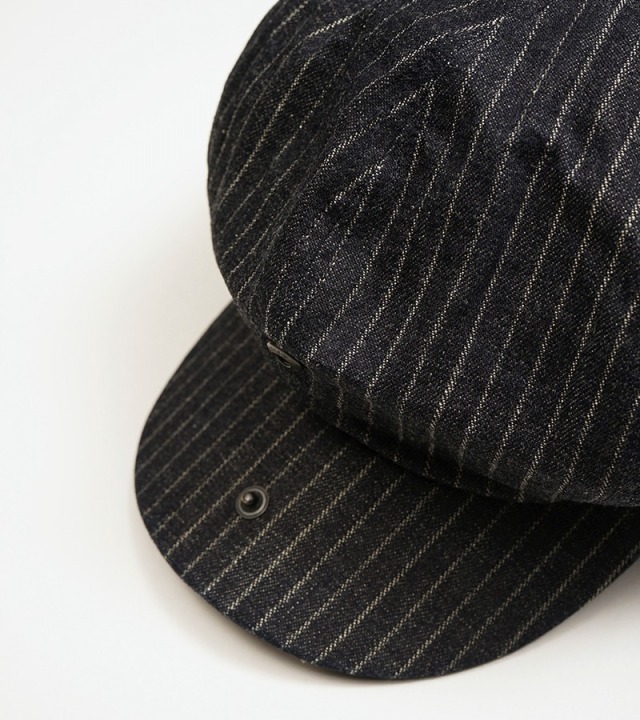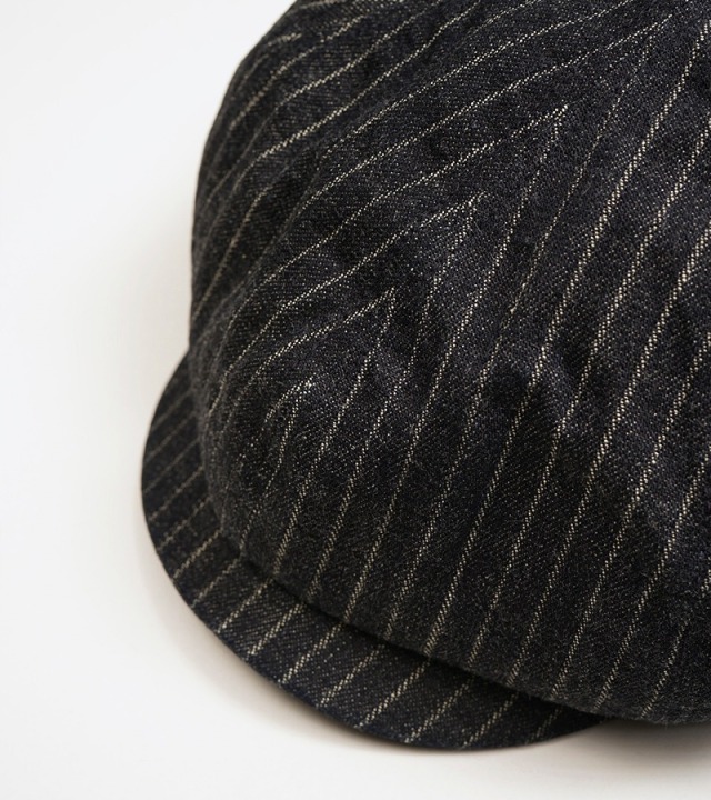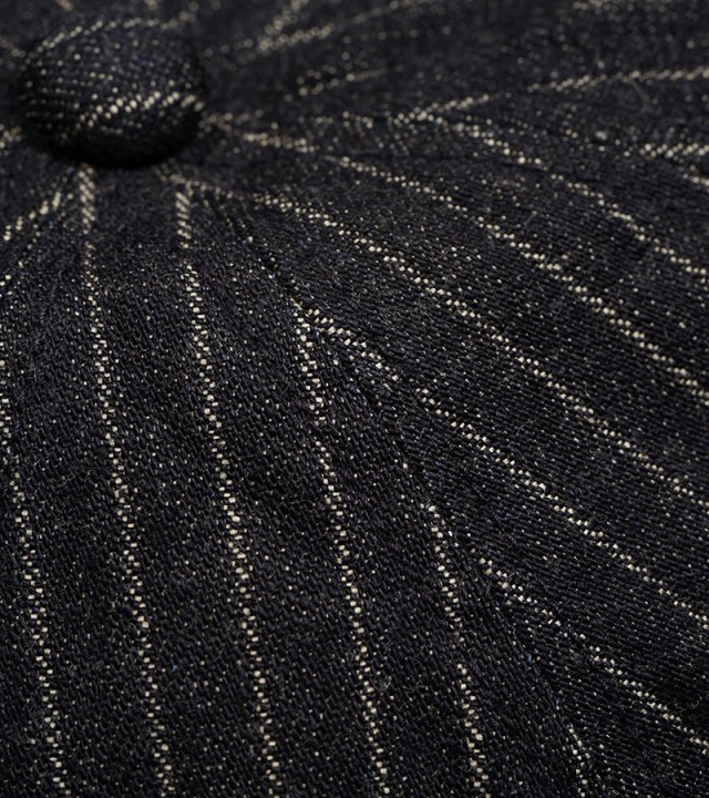ドビースライプデニムのキャスケットです。8枚はぎのボリュームのあるシルエットはかぶり方のアレンジが容易に可能です。使うほどに味の増すドビーストライプデニム素材は、春夏の帽子として頻繁に洗ってもへたれず、その風合いの変化も楽しんでいただけます。