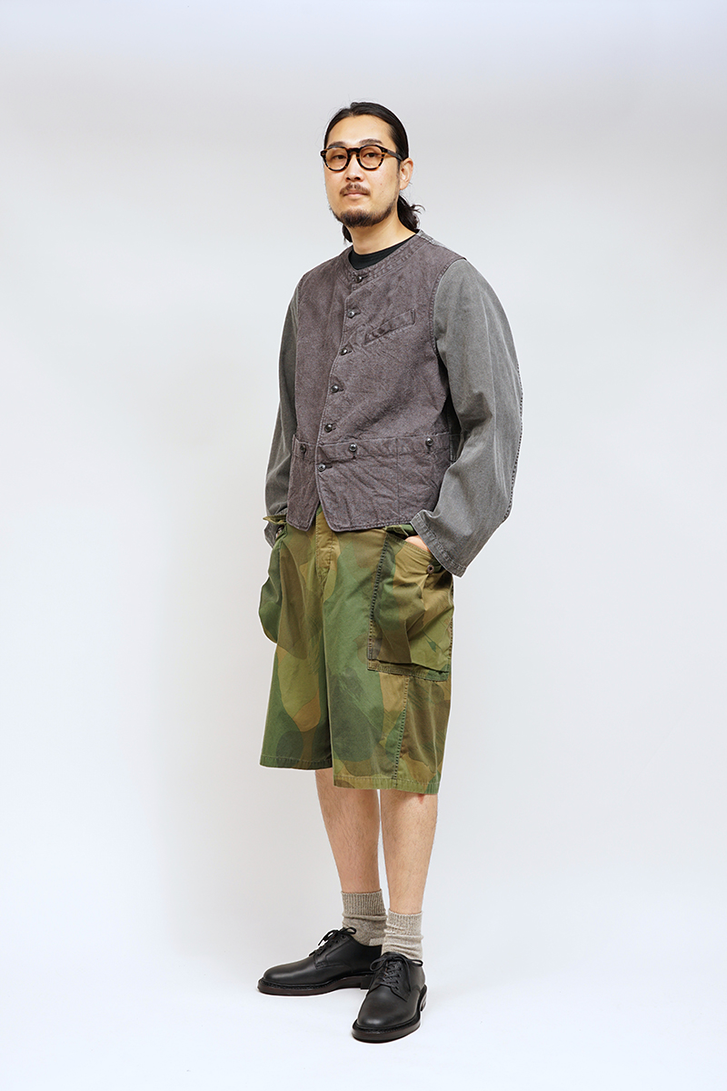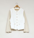 米語ではベスト、英語ではウエストコート。ジャケットの下などに着用されたこのアイテムは元々は前身頃の生地とは異なるシンプルで簡易的な袖が付いていましたが、時代を追うごとに袖が外れ、丈も短くなり、現在のカタチに落ち着きました。ちなみにウエストコートをわざわざ着用したのはブレーセスを隠すため。 本製品は希少なヴィンテージウエストコートのデザインを基にしています。ヴィンテージの素材違いも踏襲し、前身頃はヘンプ、他の袖などはパーツはコットンの顔料染です。そのため程よい経年変化を楽しむ事ができます。釦は重厚なホーン。
