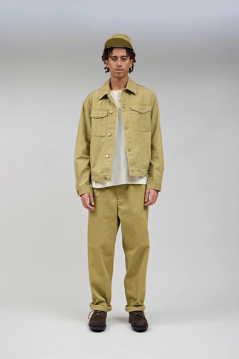 第二次世界大戦時の改良型イギリス陸軍ジャケットからインスピレーションを得たこのショートジャケットは、50年代の伝統的なデニムジャケットに似た洗練されたフィットを持ちながら、改良された軍事的なディティールを維持しています。イギリス陸軍のポケットは、表地の裏を使用した補強テープが施されており、ユニークなコントラストが特徴です。また、ヴィンテージガーメントにインスパイアされた補修パッチと裏生地のカフスも特徴です。軽量のコットン生地を使用しています。