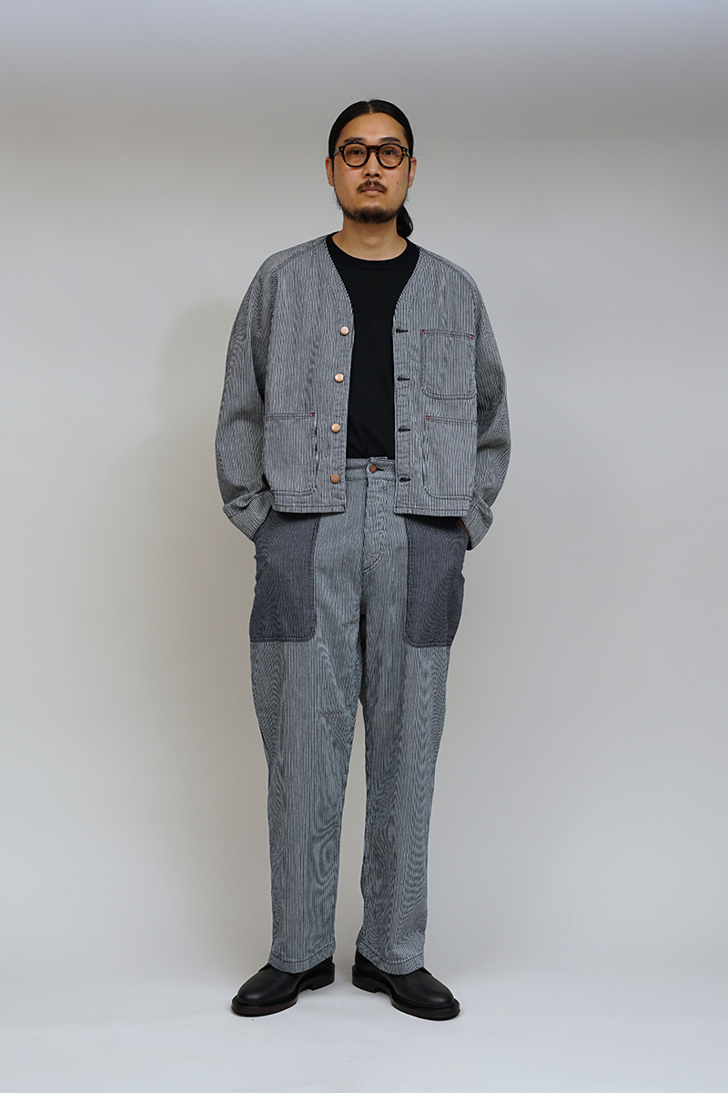 このアイテムはクラシックなヴィンテージジャケットからインスピレーションを得ており、ラグランスリーブ、トリプルステッチの構造、バータック補強のディテールが特徴です。LYBROブランドのメタルシャンクボタンがフロントとカフスに飾られています。ボクシーなフィット感で、ヒッコリーストライプデニムを使用しています。