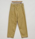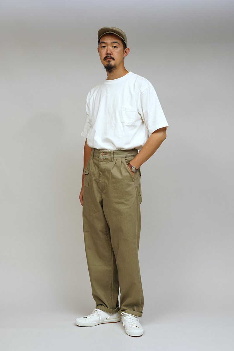 このワイドパンツは、クラシックなワークウェアを基にしており、前面に2つのフロントプリーツとサイドポケットが特徴です。前面にはパッチチェンジポケットがあり、背面にはボタンダウンフラップ付きのパッチポケットが2つあります。内部の補強により、表地のガーメントには美しいステッチラインが生まれます。このパンツは軽量のコットン生地を使用しています。