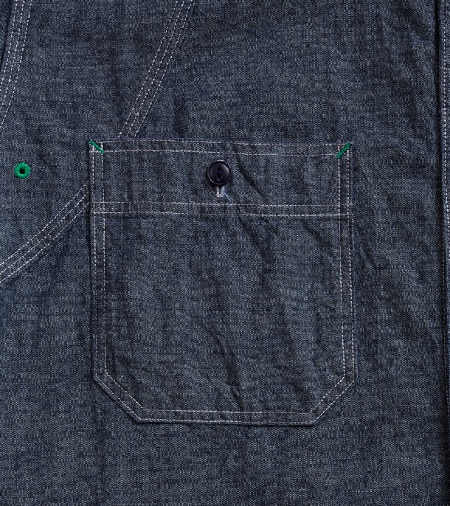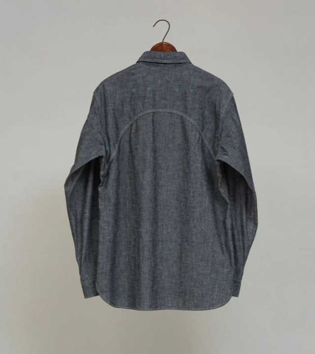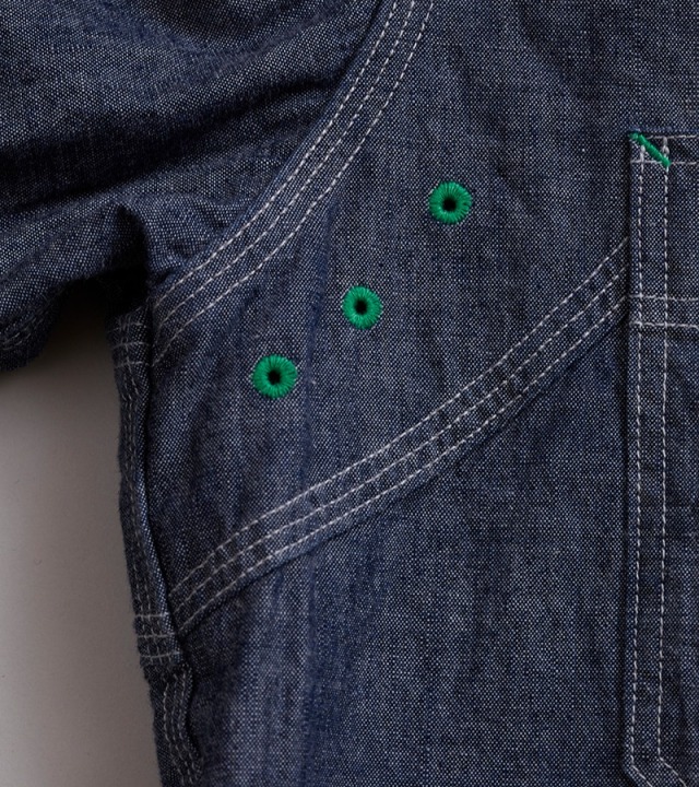 一般的なシャツは背ヨークの部分のみが2枚の生地が重なっていますが、本製品はアームホール全周から肩、背にかけて生地が2枚重ねになった特徴的な構造になっています。こうして上半身で最も運動量の大きい両腕を中心とした部分ががっちり補強されている訳です。また、袖口から肘に掛けて腕部分も二重構造になっておりハードな使用に耐えうる設計になっています。ボディ部分が2重に補強されているため、そのままでは通気性に劣ります。これをカバーするために背中に4個、脇に4個の菊穴が開けられており、ベンチレーション機能を付与されています。比較的単純な仕様に見えますが、生地に丸い穴が開いていることになります。生地は通常タテ・ヨコの糸で構成されていますので、その連結を断ち切る穴はそこから生地を破壊してしまう要因になります。その部分を特殊なミシンで加工し、長期間の着用にも充分耐えうる強度にあげるには高い加工精度が必要になります。