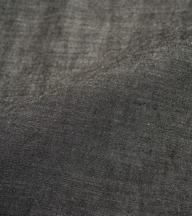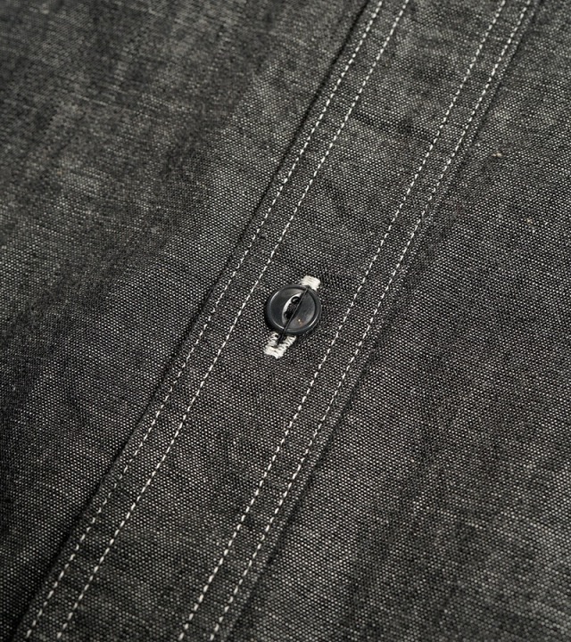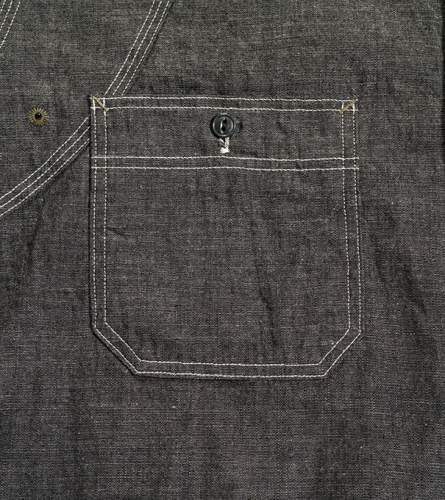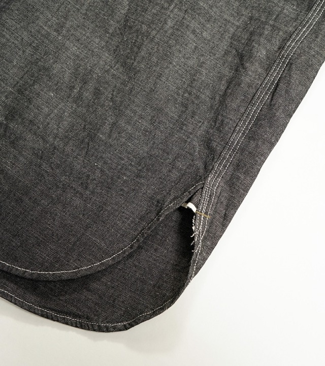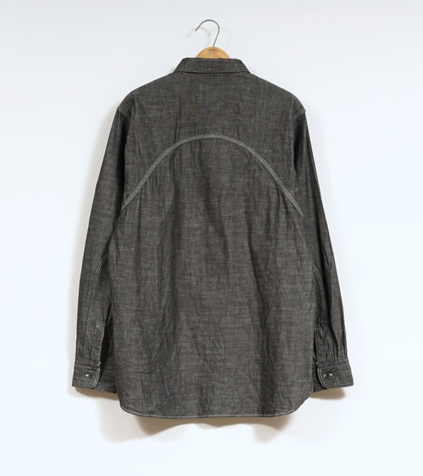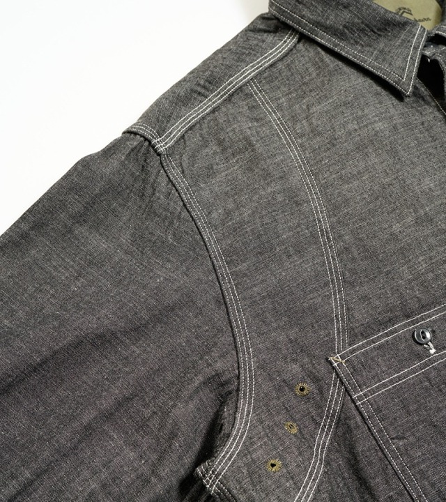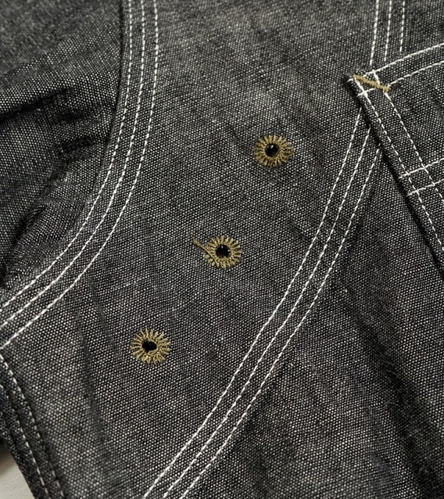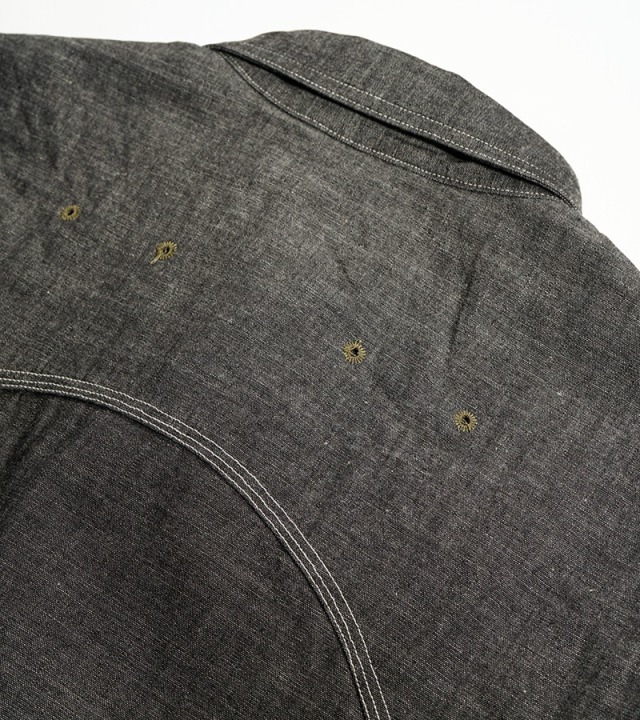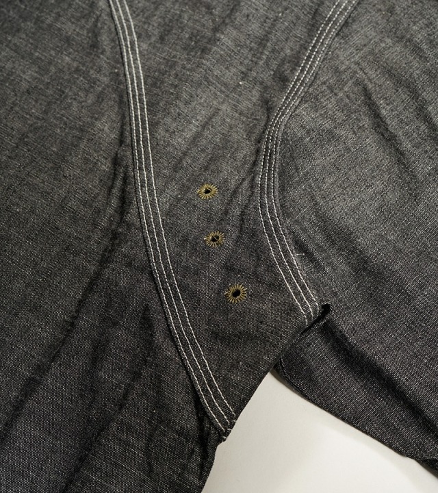 一般的なシャツは背ヨークの部分のみが2枚の生地が重なっていますが、本製品はアームホール全周から肩、背にかけて生地が2枚重ねになった特徴的な構造になっています。こうして上半身で最も運動量の大きい両腕を中心とした部分ががっちり補強されている訳です。また、袖口から肘に掛けて腕部分も二重構造になっておりハードな使用に耐えうる設計になっています。ボディ部分が2重に補強されているため、そのままでは通気性に劣ります。これをカバーするために背中に4個、脇に4個の菊穴が開けられており、ベンチレーション機能を付与されています。比較的単純な仕様に見えますが、生地に丸い穴が開いていることになります。生地は通常タテ・ヨコの糸で構成されていますので、その連結を断ち切る穴はそこから生地を破壊してしまう要因になります。その部分を特殊なミシンで加工し、長期間の着用にも充分耐えうる強度にあげるには高い加工精度が必要になります。