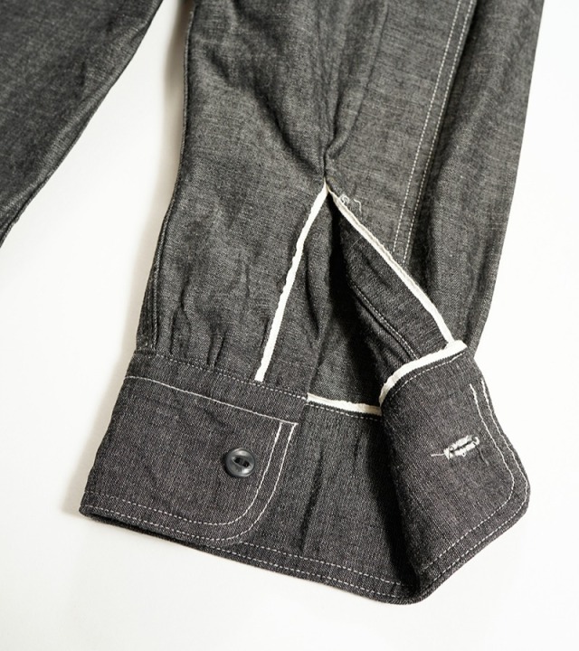 ボタンは堅い椰子の実を加工したキャッツアイを使用しています。その名の通り、猫の目のように中央部分に鋭く切り込みが入っています。この切り込みの溝の部分に糸が沈むようになっており、糸切れによるボタンの脱落を防ぐディティールです。