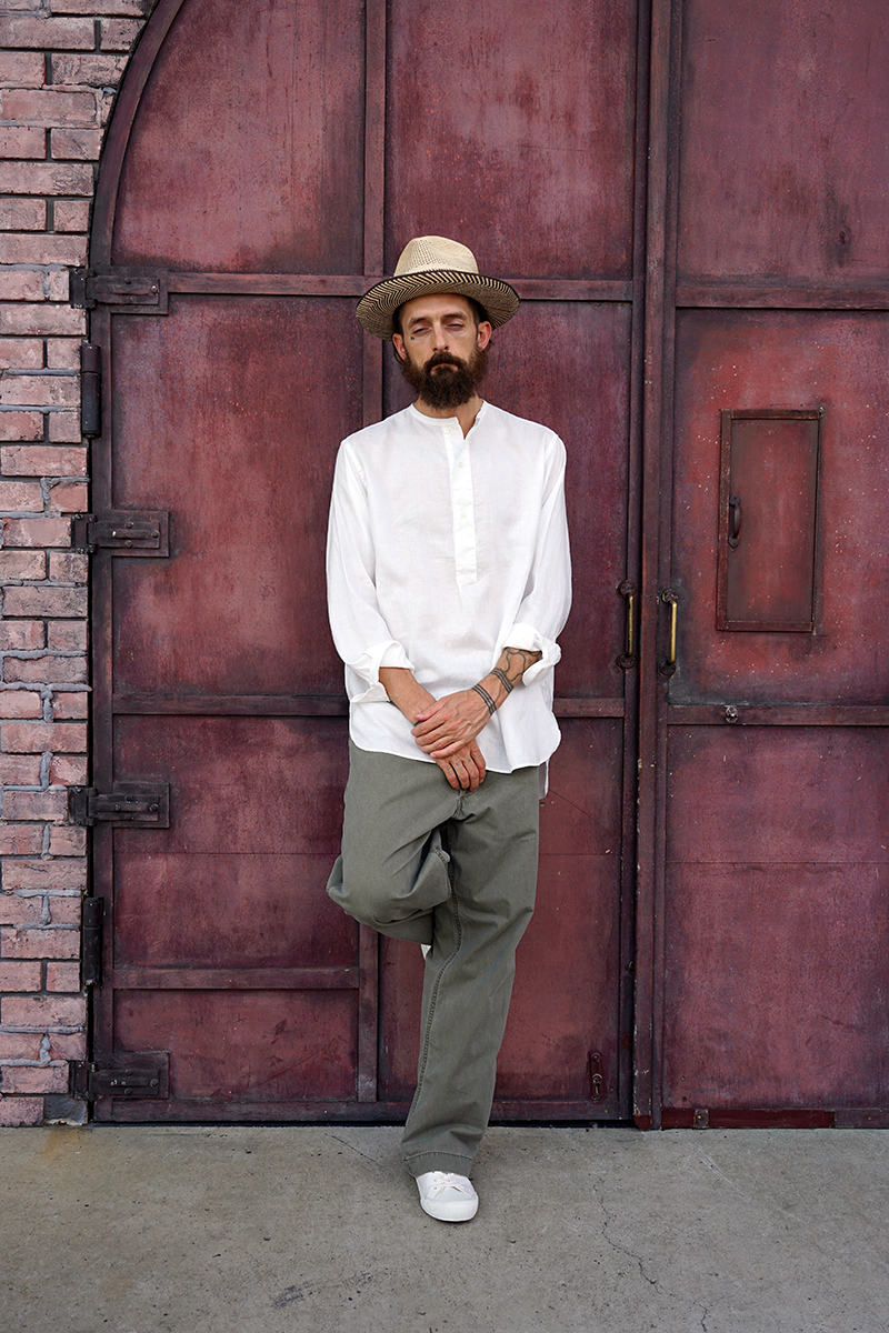 夏のワーカーのためにデザインされたワークシャツ。最大のポイントは夏に相応しい軽やかなシャツをロールアップできるような、あらたな袖の設計が施されていること。通常のシャツ袖はアームホールから手首に向かって急速に筒が細くなり、袖口にはカフスが付きます。このカフスとソデを破綻なく繋ぐパーツとして、剣ボロがセットされています。長袖として着用した際に最も機能的に着用しやすいデザインであるとも言えるでしょう。これら通常のシャツに対して今シーズのシャツは新たな設計に置き換えています。 新設計のポイントは、1900年代初頭の英国ヴィンテージワークウェアの袖の構造を参照したこと。ベースになったヴィンテージの筒袖は袖口幅が充分が充分確保されています。当然のそのままですと手首がブカブカになりますのでカフスパーツを付け、手首側で強引に袖幅を絞る工夫が施されています。これはとりもなおさず、ロールアップしやすいように、またロールアップした際に腕を必要以上に締め付けず作業がいやすいよう考慮されたデザインです。