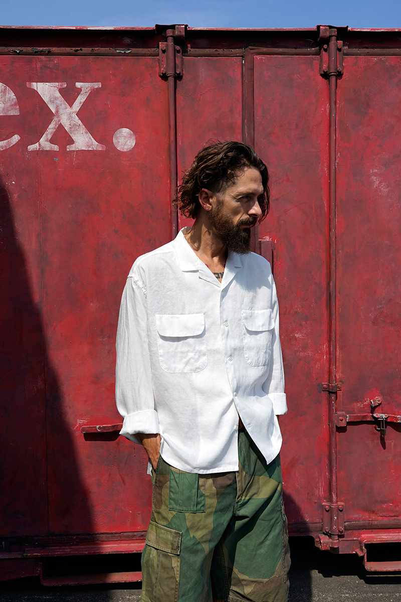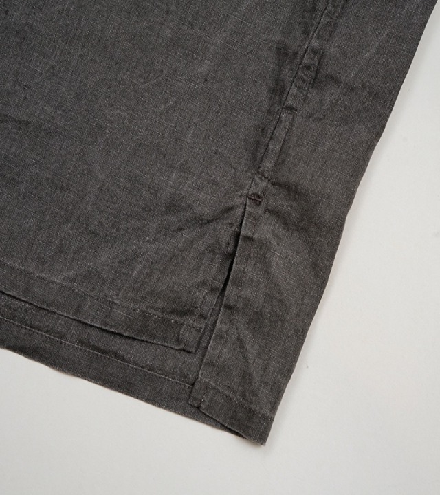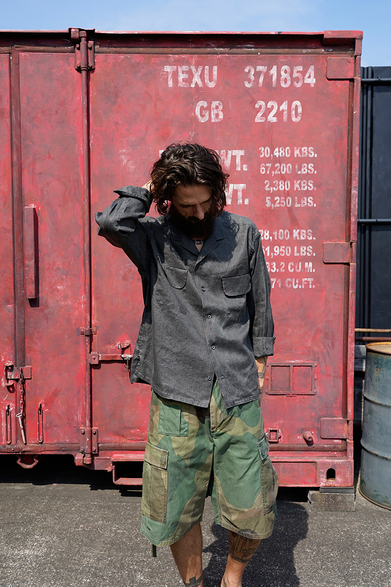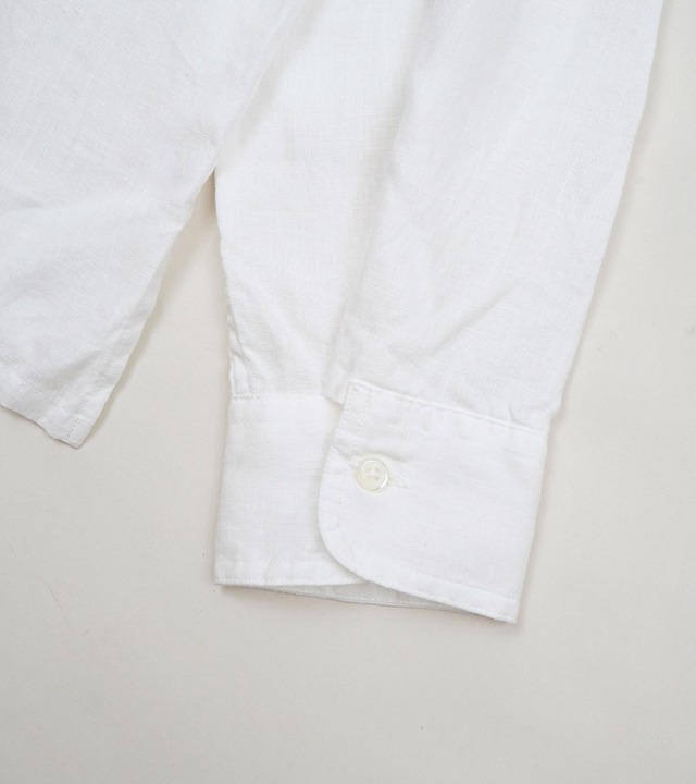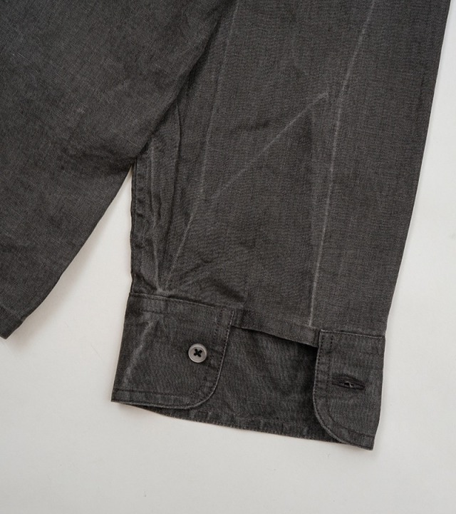 夏のワーカーのためにデザインされたワークシャツ。最大のポイントは夏に相応しい軽やかなシャツをロールアップできるような、あらたな袖の設計が施されていること。通常のシャツ袖はアームホールから手首に向かって急速に筒が細くなり、袖口にはカフスが付きます。このカフスとソデを破綻なく繋ぐパーツとして、剣ボロがセットされています。長袖として着用した際に最も機能的に着用しやすいデザインであるとも言えるでしょう。これら通常のシャツに対して今シーズのシャツは新たな設計に置き換えています。 新設計のポイントは、1900年代初頭の英国ヴィンテージワークウェアの袖の構造を参照したこと。ベースになったヴィンテージの筒袖は袖口幅が充分が充分確保されています。当然のそのままですと手首がブカブカになりますのでカフスパーツを付け、手首側で強引に袖幅を絞る工夫が施されています。これはとりもなおさず、ロールアップしやすいように、またロールアップした際に腕を必要以上に締め付けず作業がいやすいよう考慮されたデザインです。