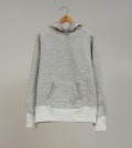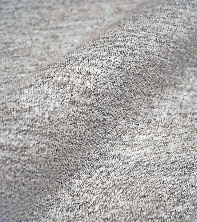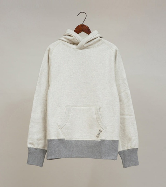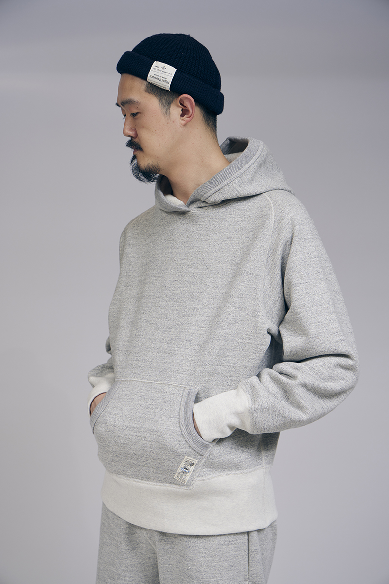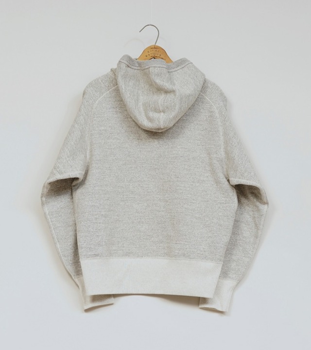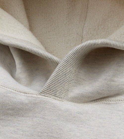 1950年代のアメリカのビンテージパーカーをベースにしています。スウェットの中でも通常16.5ozはかなり厚手に相当しますが、本製品はそれよりも厚い20.5ozのファブリックを使用。ドライタッチで長年の着用や洗濯にも強く、堅さやハリが残るので、形崩れしにくいのが特徴です。本製品は吊り編み機で編んだようなビンテージスウェット特有のヨコ段が走る表情に編まれています。