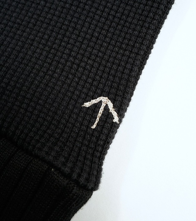 英国空軍と海軍のタートルネックセーターをベースにした製品です。オリジナルはヘビーゲージのウールですが、雰囲気をそのままに扱 いやすいコットン製のカットソーに置き換えました。肌と素材の間に空気を溜める保温性の高いワッフル素材の特性を生かし、ニットと同等かそれ以上の暖かさをもたらしつつ、洗濯等のお手入れはニットほどデリケートでは無い扱いやすい製品です。本製品のワッフル組織は、糸そのものの性質と編地組織のバランスを入念に計算して設計する事で、長い着用にも簡単にはダレないものに仕上げています。