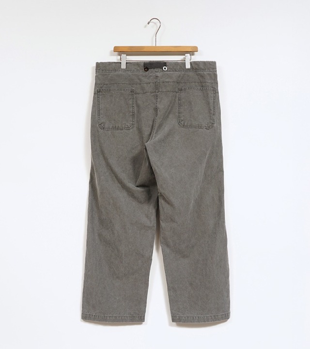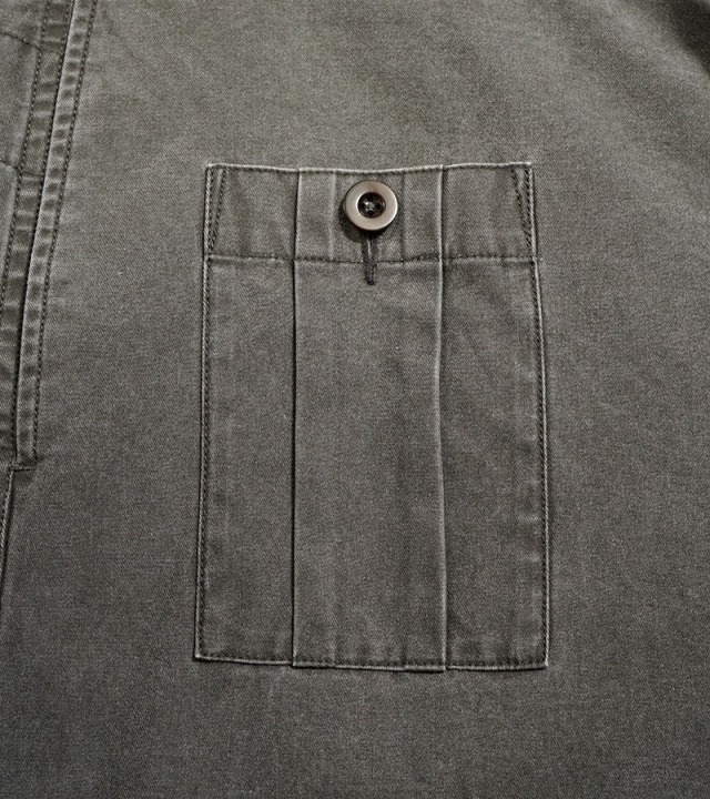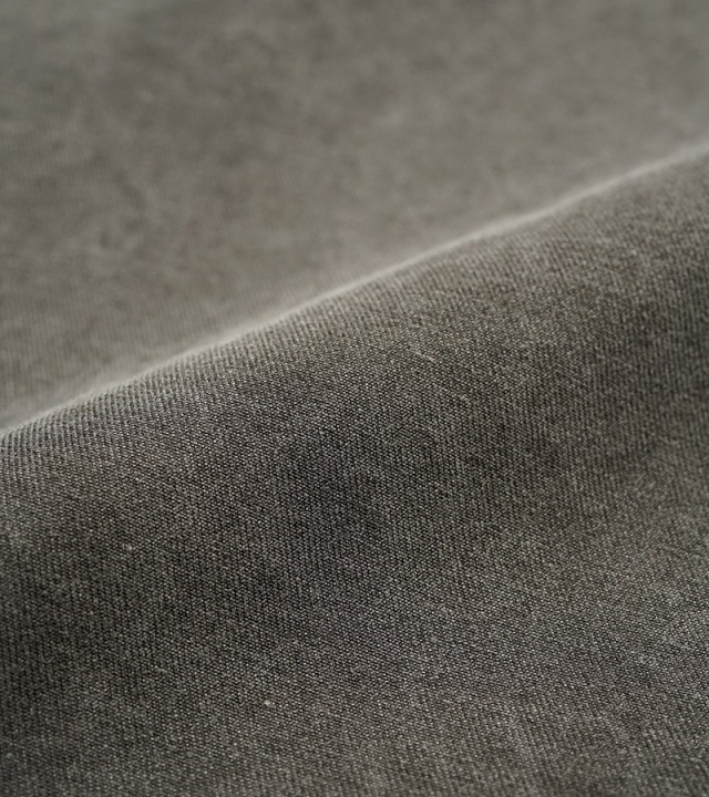素材はピグメント染め。ピグメントとは顔料とも呼ばれるとおり化粧品の着色材料としても用いられています。化粧品着色料は肌に乗って発色しますが、水などで洗い流す事ができ肌に残りません。それは染料の粒子が大きいため肌の細胞に浸透しないためです。ガーメントに用いた場合は着用に応じた経年変化を楽しむ事が出来ます。