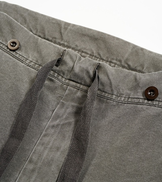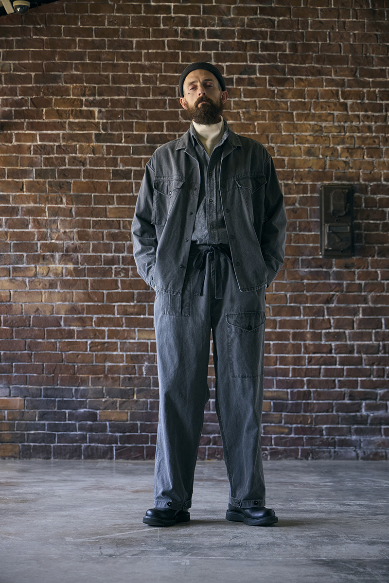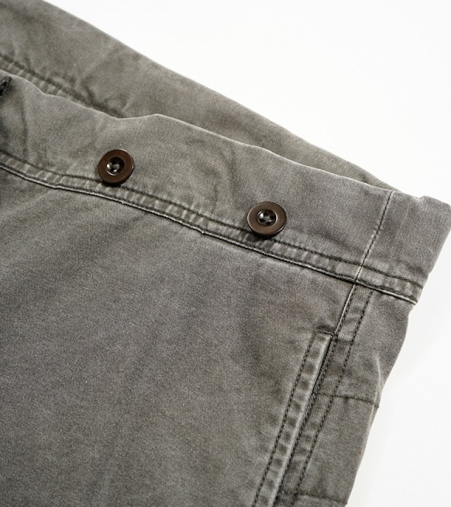 落下傘降下兵が着用したオーバーパンツをベースにしたデザインです。敵陣の奥深くまで侵入し地形と時間の制約を受ける事なく一気に拠点を設ける戦術は第2次大戦時における航空機の発展に伴い現実化しました。落下中の風圧に耐え装備品ごと全てをカバーするよう設計されています。引っ掛かりなどの要因となる仕様は排除されセットになる上着の方はプルオーバーのスモックタイプとなっています。上下がツナギとなった形状のものも存在し、その使用目的からジャンプスーツとも呼ばれています。