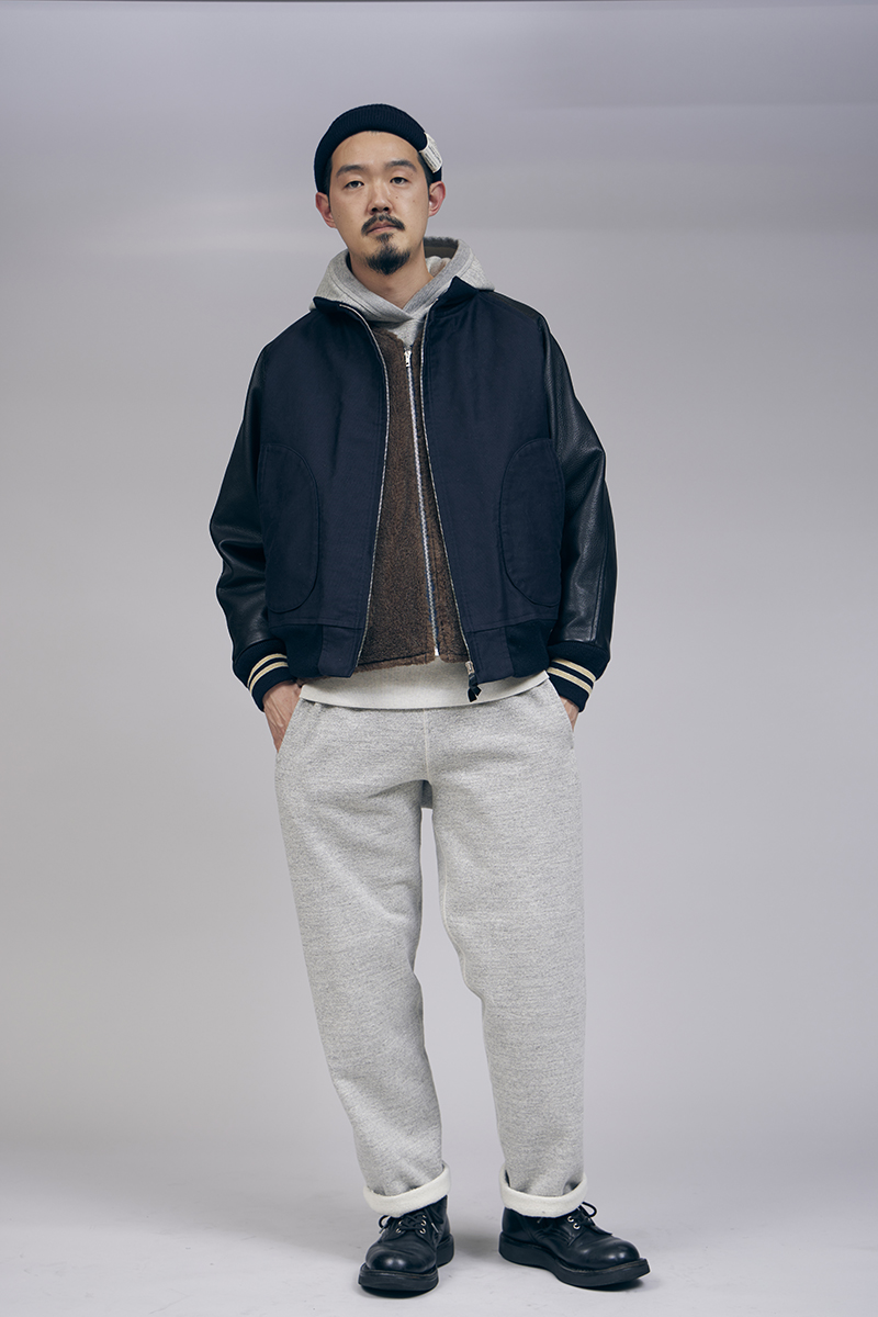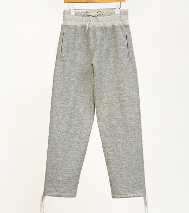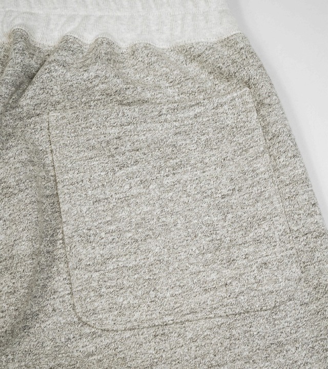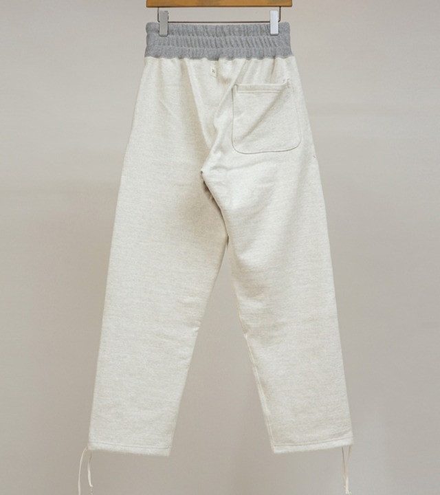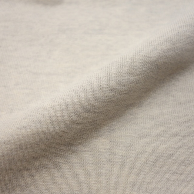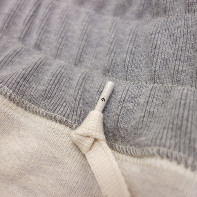 度詰めの20.5ozのヘビーozのジャージ生地を用いた、 ミリタリーのトレーニングウェアーをベースにしたスウェットパンツです。スウェットの中でも通常16.5ozはかなり厚手に相当しますが、本製品はそれよりも厚い20.5ozのファブリックを使用。ドライタッチで長年の着用や洗濯にも強く、堅さやハリが残るので、形崩れしにくいのが特徴です。吊り編み機で編んだようなビンテージスウェット特有のヨコ段が走る表情に編まれています。