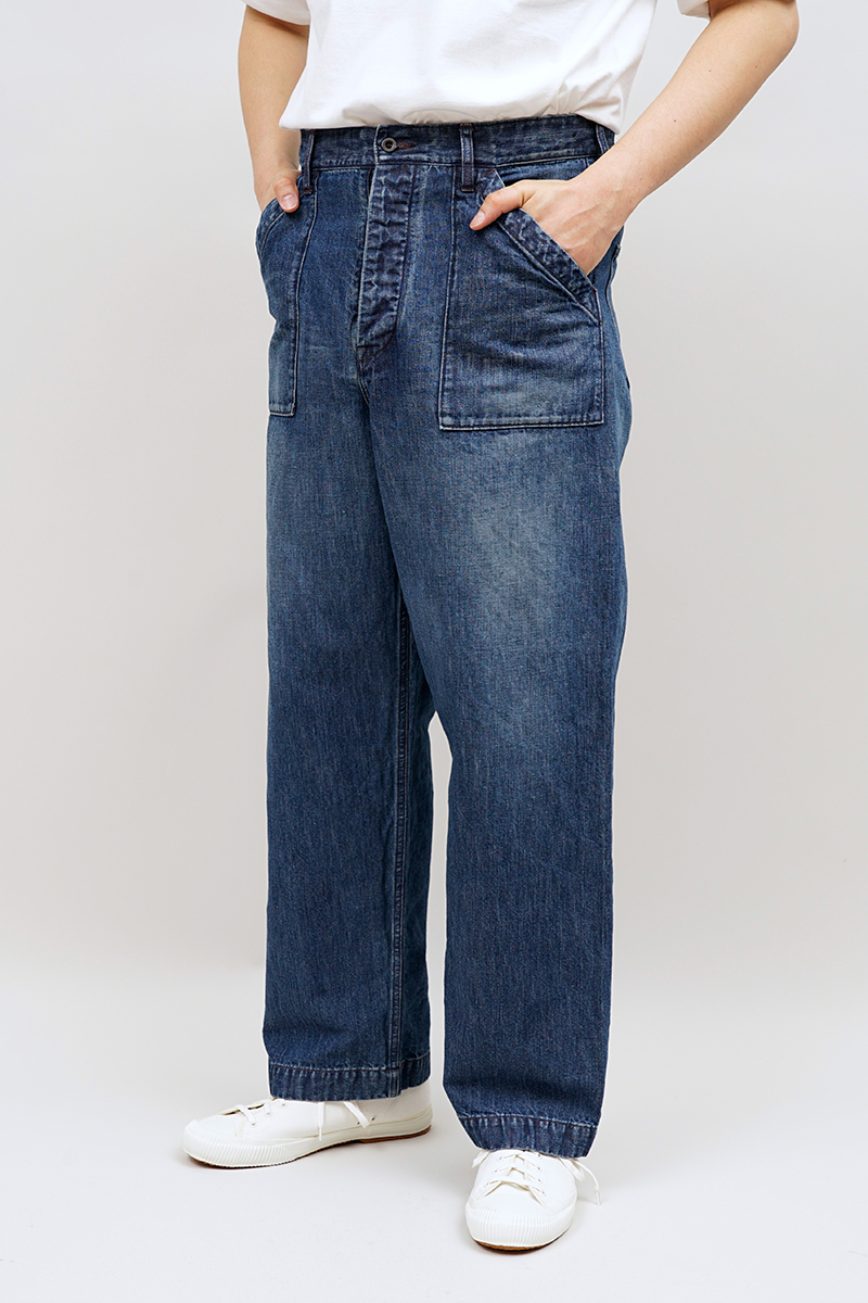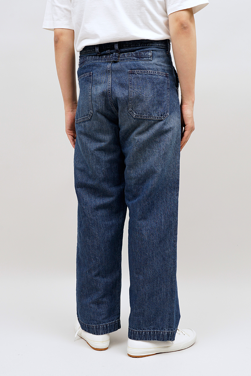U.S.NAVYで運用されていたデニムトラウザーをベースに、コットンリネンデニムに置き換えました。コットン62%、リネン38%の混紡でオンスも10ozほど。デニムが持つラギッドな表情はそのままに、リネンの清涼感が加わっています。エイジング加工により全体を程よくフェードさせ、腿から膝にかけて長年穿き込んだかのようなアタリを付与しています。