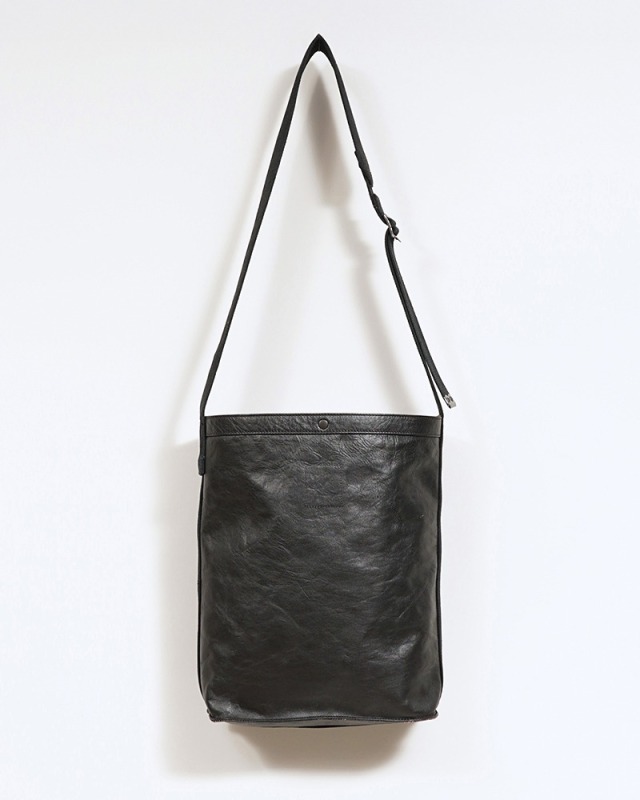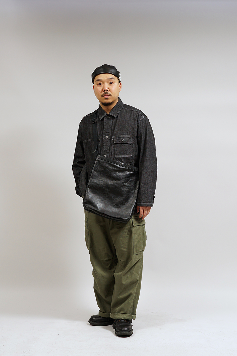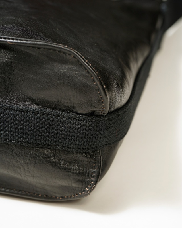 ホースハイドののメールバッグです。レザーは”ブラウンコアレザー”。所謂”茶芯レザー”です。茶芯とはBrownの革の表面を別の色で染色を施したレザーを指します。多くの場合は表面がBlackで染められており、本製品はそれに該当します。使い込むことで表面のBlackが擦れて下のBrownが露出し、独特なエイジングが楽しめます。