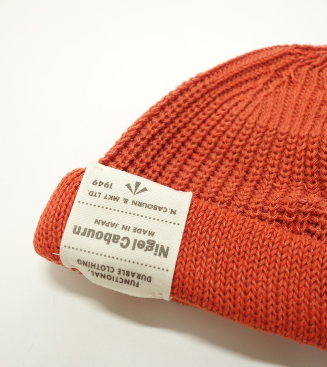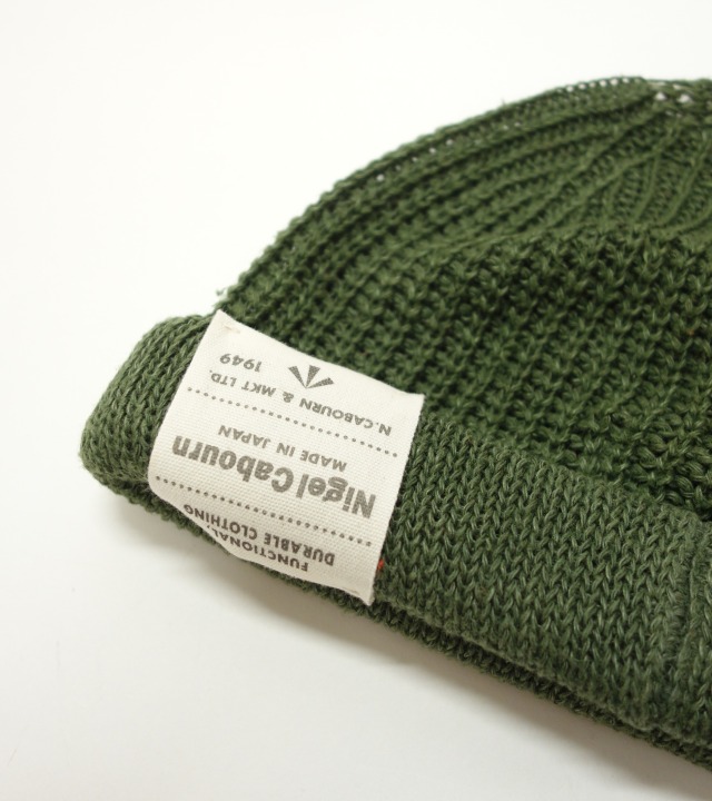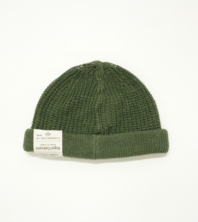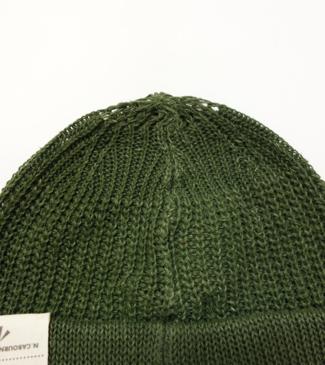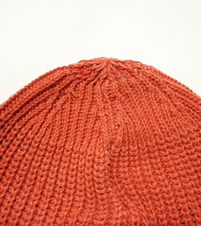 US.NAVYのヴィンテージがモチーフ。ロール部の編地を袋編みにしており、 ボリューム感を出しています。ヴィンテージにあった、ロールアップすることで逆さになったネームをデザインとして採用。素材はリネン100%でピグメント=顔料による染色を施し、色合いの変化も楽しみなビーニーです。