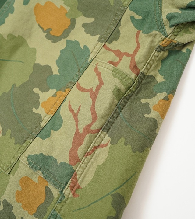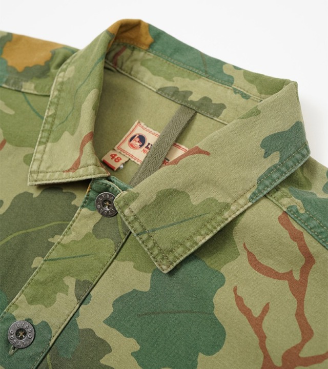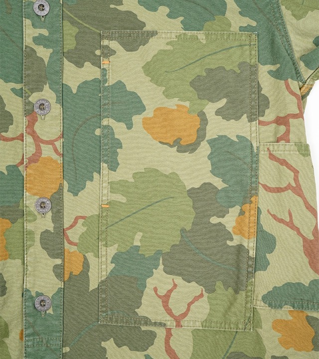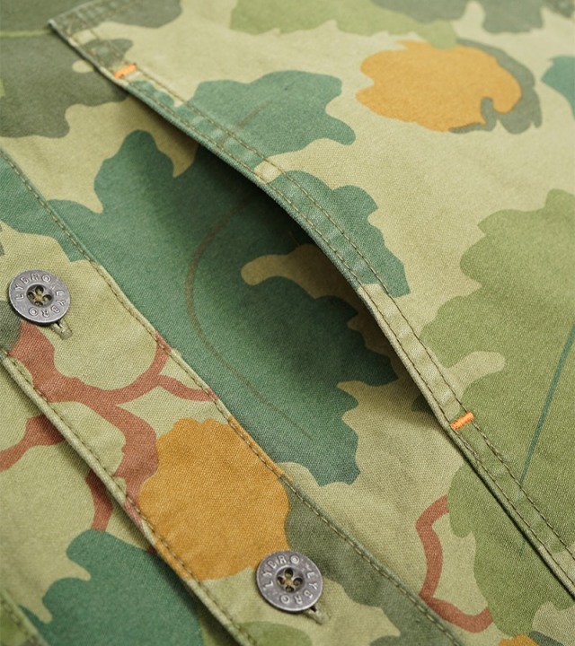 戦時中の余剰生地から作られた「ポスト・ウォー・ワークウェア」というシーズンコンセプトにインスパイアされた、最新のカモフラージュ柄のユーティリティシャツ。ナイジェルも愛用するミッチェル・パターンカモフラージュは、1953年に海兵隊のハーフテントに初めて使用されたものです。