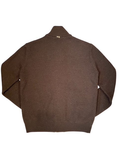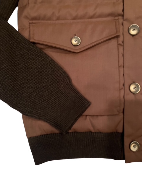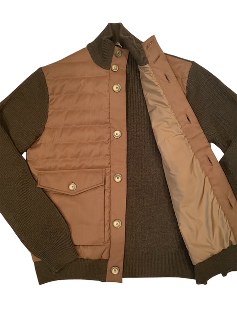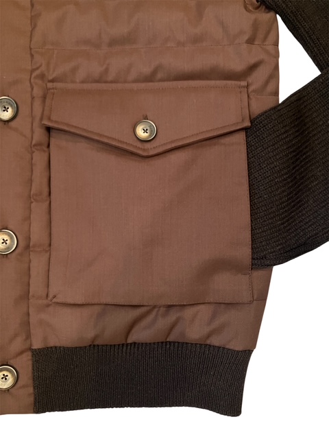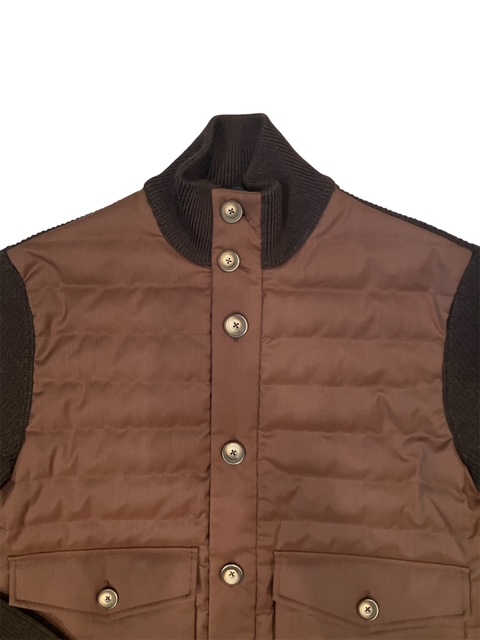 キルティングフロントとニット袖、リブ編みの袖口で構成される、
