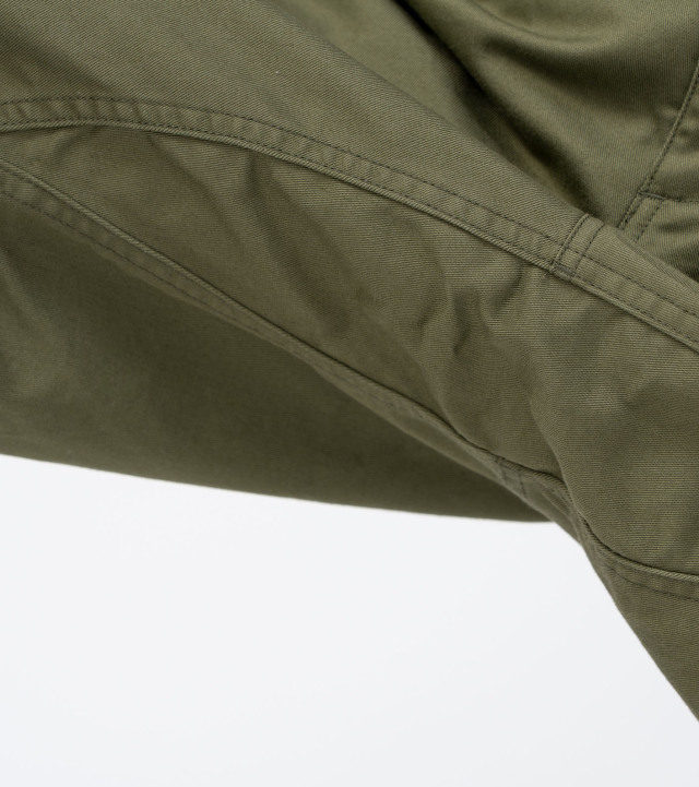 ・ウエストはウェービングベルト仕様。フロント腰ポケットの袋布は小さな物が落ちにくい仕様で、股下には脚の可動域を妨げないマチ付きです。ヒップとワタリにボリュームを持たせ、裾にダーツを入れた丸みのあるワイドテーパードカットです。