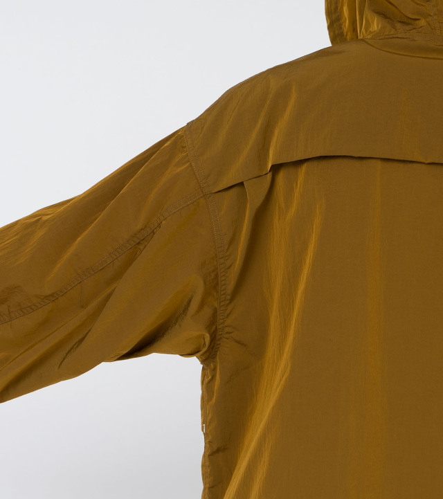 ・リサイクルナイロンタフタを使用したジップアップパーカー。経糸をベースカラー、緯糸をブラックにすることで色の陰影が生まれ立体的に見えるのが特徴。表面には、環境に配慮した非フッ素系のはっ水加工を施しています。