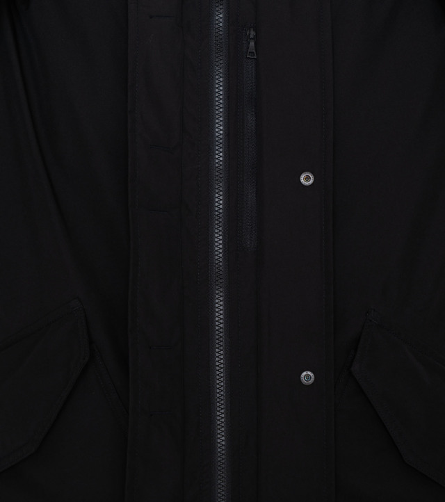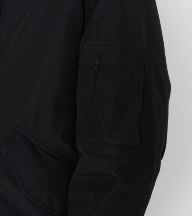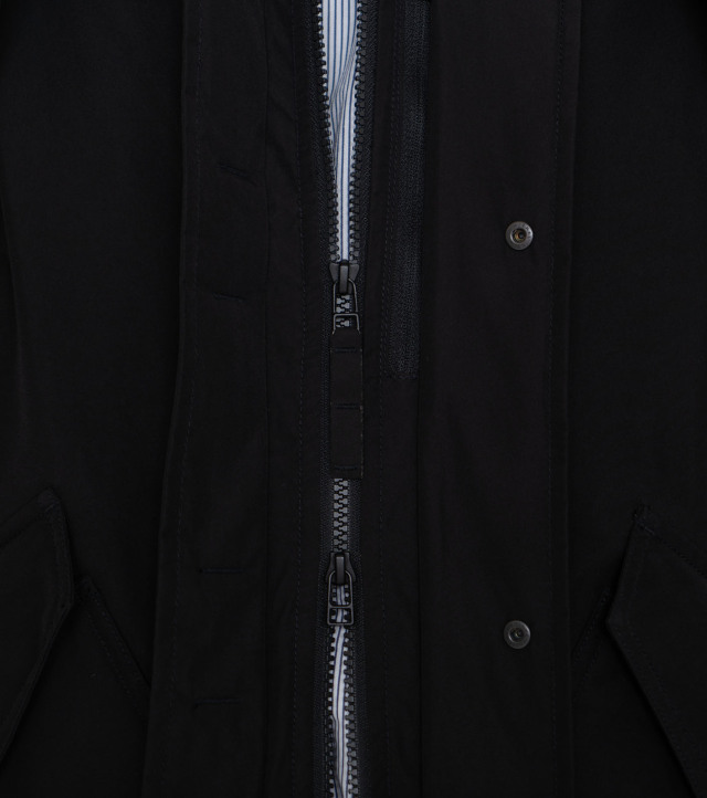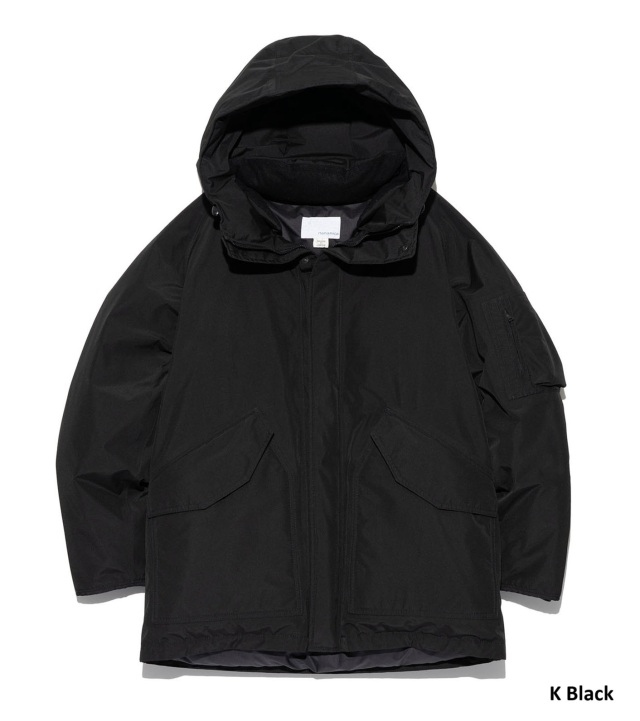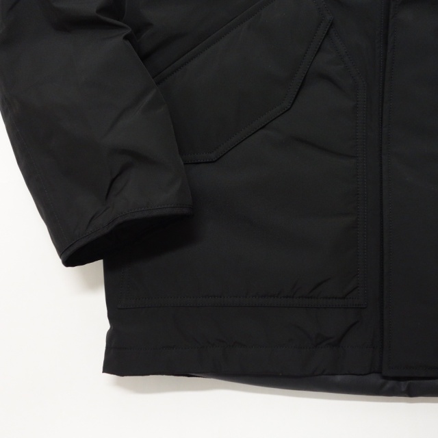 ・ミドル丈のフーデッドダウンコートです。表地には防水透湿素材の2L Polyester GORE-TEX Fabricsを使用。裏地にはポリエステルリップストップを使用しています。フロントは片手でもドットボタンが留められるワンハンドスナップ仕様で、フライトジャケットをベースにしたパッチ&フラップポケットを配置します。